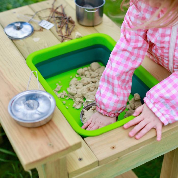Dankzij het compacte formaat kunnen modderkeukens zowel buiten als binnen flexibel worden gebruikt. Als je geen tuin hebt, kun je het zandplezier voor je kinderen zelfs op een groter balkon installeren. De moddertafel kan ook dienen als "interieur" voor een speelhuisje. Bovendien heb je in vergelijking met een zandbak veel minder speelzand nodig als verbruiksmateriaal.
