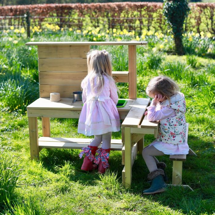 Hout is (mits zorgvuldig beschermd en onderhouden) een duurzaam, robuust en ecologisch materiaal. Bovendien past een houten modderkeuken buiten uitstekend in de tuinomgeving en vormt het een harmonieuze aanvulling op andere speeltoestellen zoals speeltorens en speelhuizen.