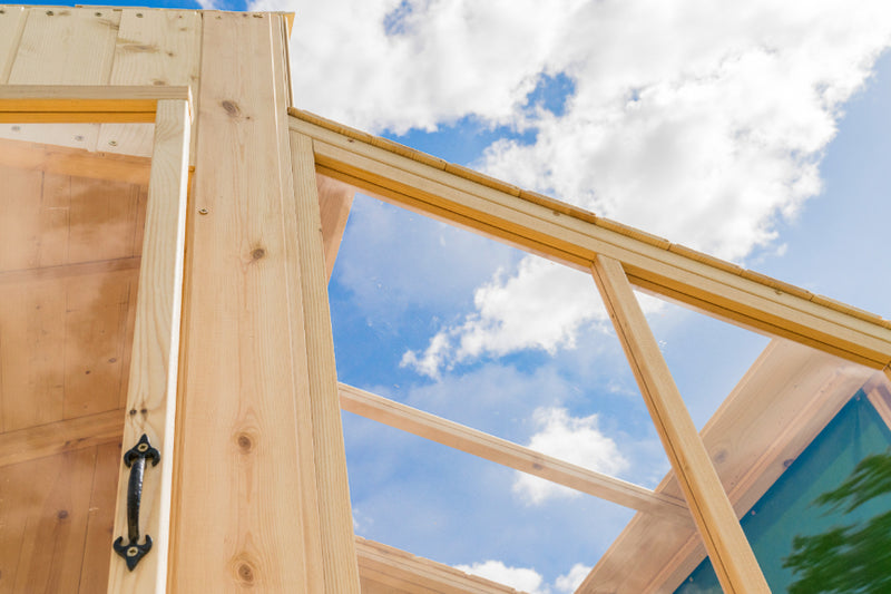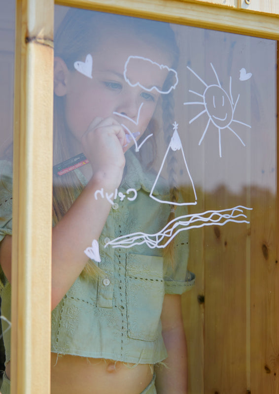 Voor de ramen van een speelhuis wordt vaak acrylglas gebruikt. Dit is een doorzichtige kunststof die flexibel, onbreekbaar en ongeveer twee keer lichter is dan 'echt' glas. Dit maakt het materiaal een veilige keuze voor een speelhuis voor kinderen.