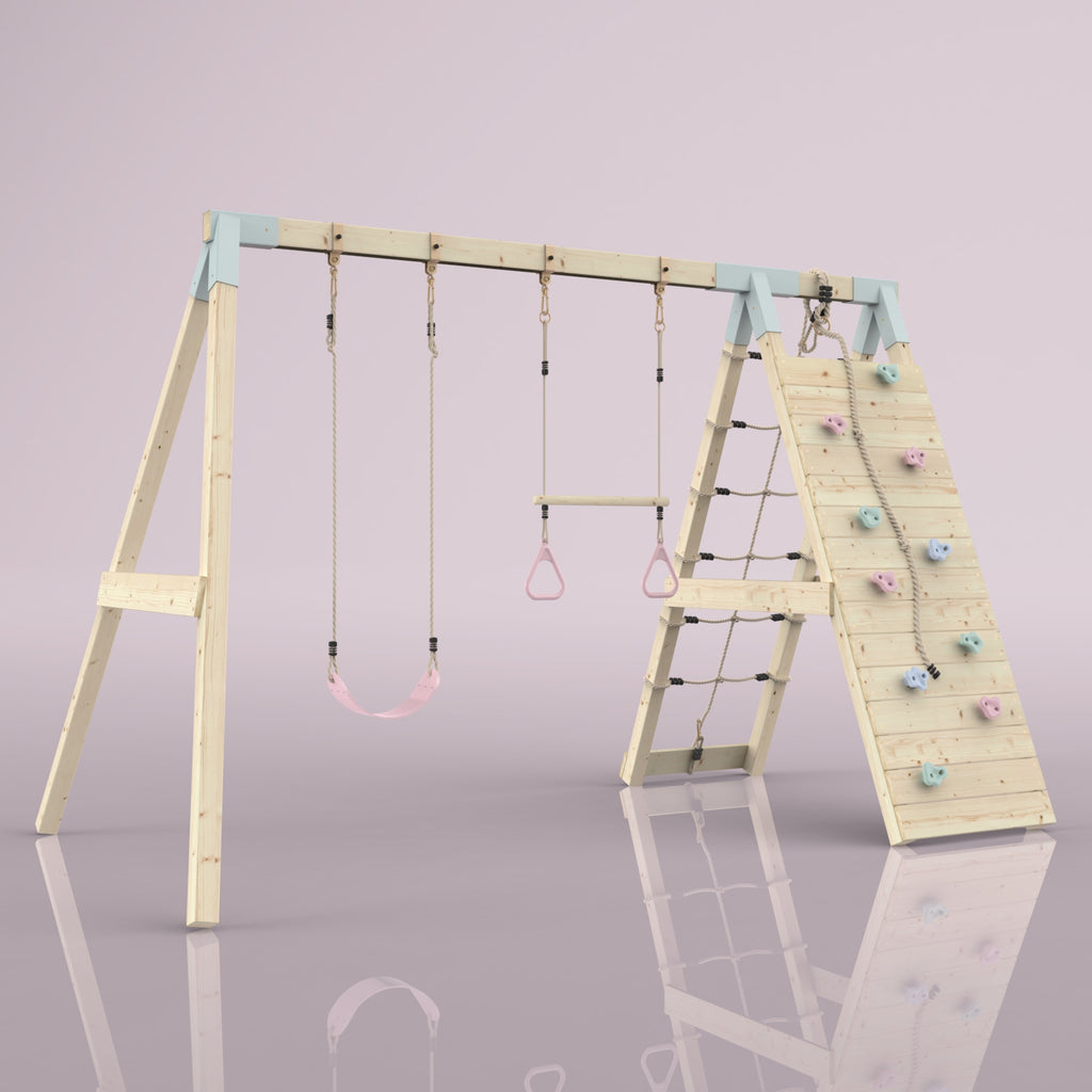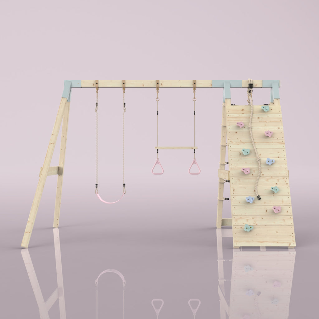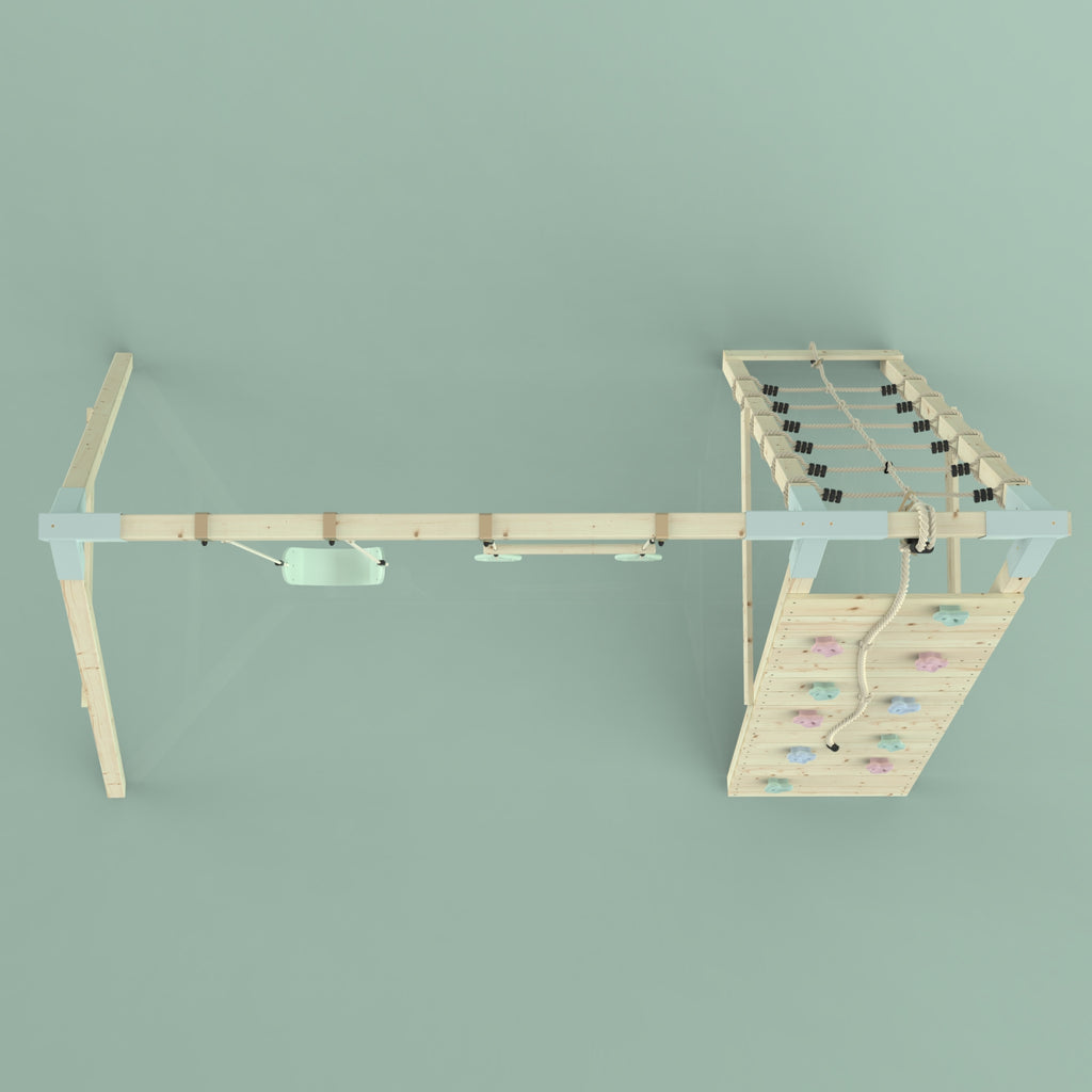 Naast de schommel en de trapezestok kunnen je kinderen zich ook uren uitleven op de klimwand en klimnetten.